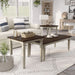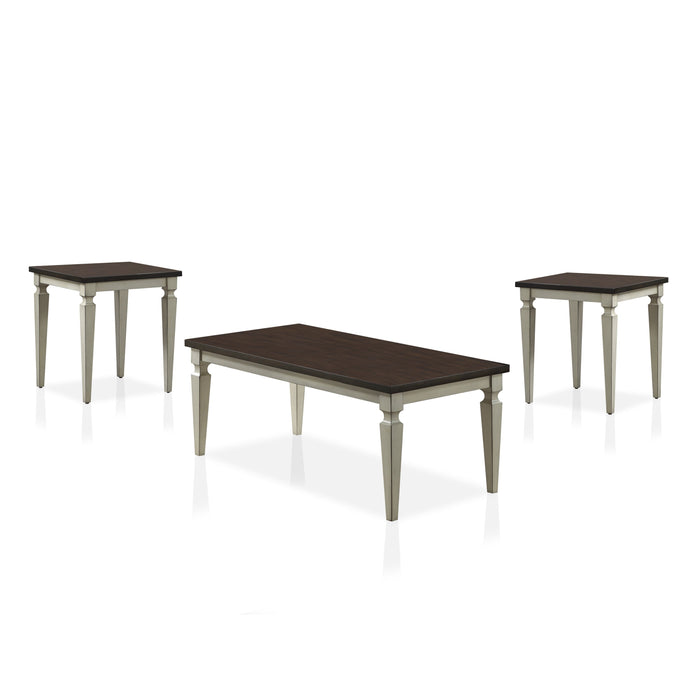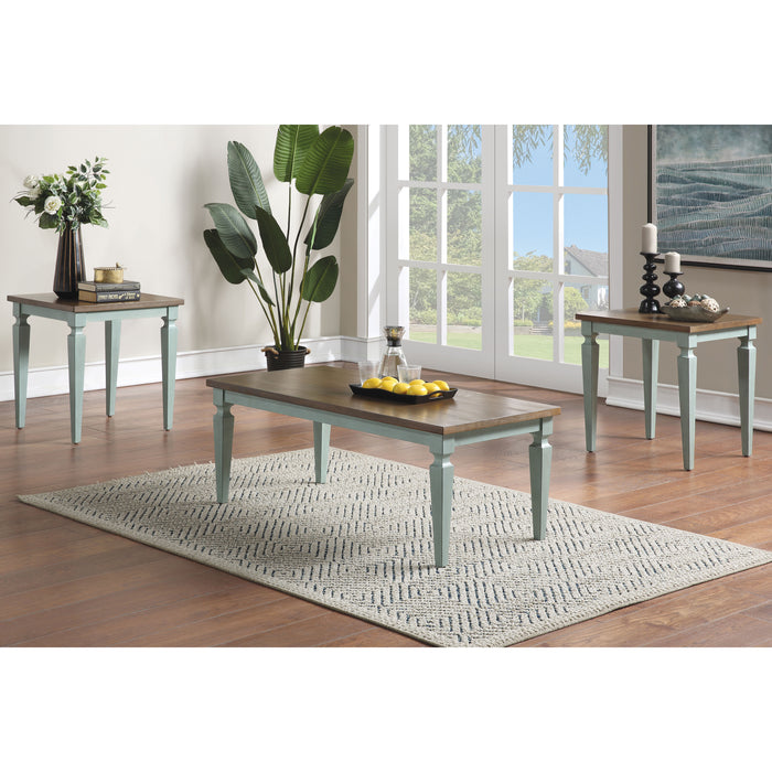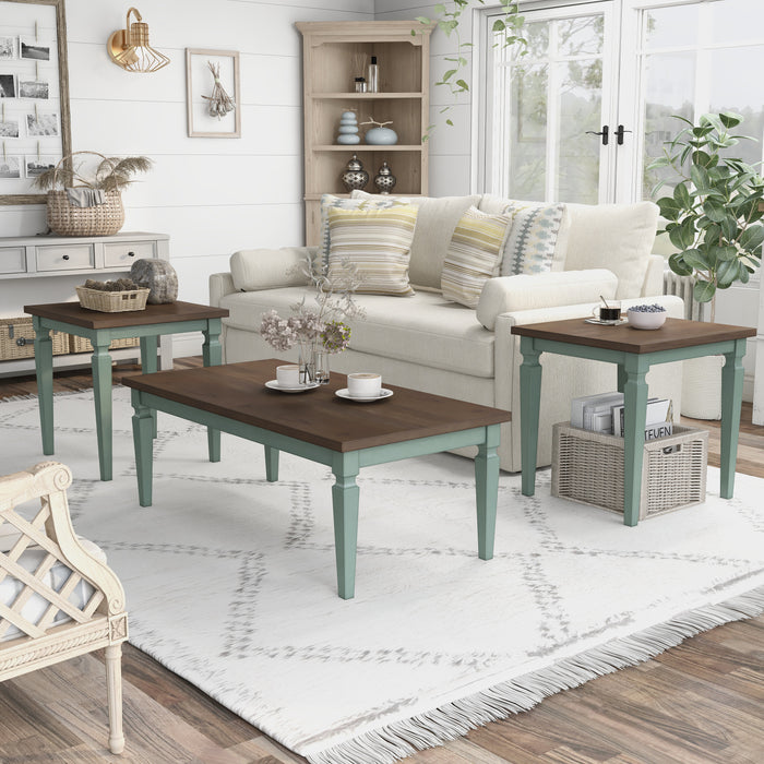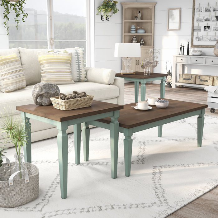 This transitional 3-piece living room set, including a coffee table and 2-end tables, is the perfect assortment to create a farmhouse style. The piece is formed by Okoume veneer and decades durable acacia wood. The tables poised on tapered legs come in 2-color options: Antique Blue with Oak tabletops or Antique White with Brown tabletops.
