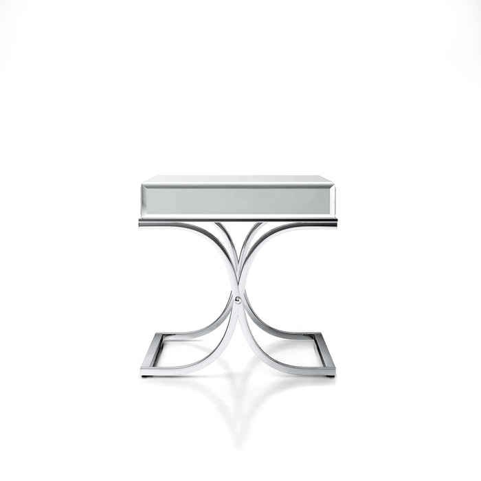 Alluring glam design with soft romantic elements yields elegance in this modern metal coffee table set. Enjoy the ornately curved end units that contrast with a linear, modern tabletop, injecting fresh energy into any room. With a blend of metal tubing and a mirrored glass top, these decadent, chrome finish tables present a perfect mix of motifs that adapt to custom interior decor.