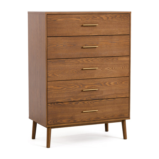 Elevate your bedroom with our midcentury modern wooden storage chest, crafted from solid rubberwood and finished in rich walnut. Featuring five spa...