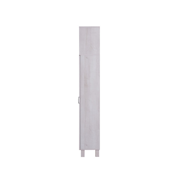 Versatile, this cabinet acts as a wardrobe armoire in the bedroom or a pantry in the kitchen. The double doors serve up four shelves. Plus, an open upper shelf offers easy access to items.