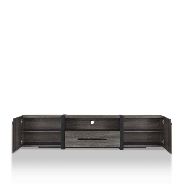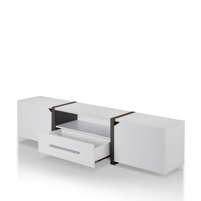 This sleek modern-inspired TV stand boasts a charming two-tone finish with multiple storage options. The flat panel doors conceal spacious shelves to store electronics and accessories without losing that linear appeal.