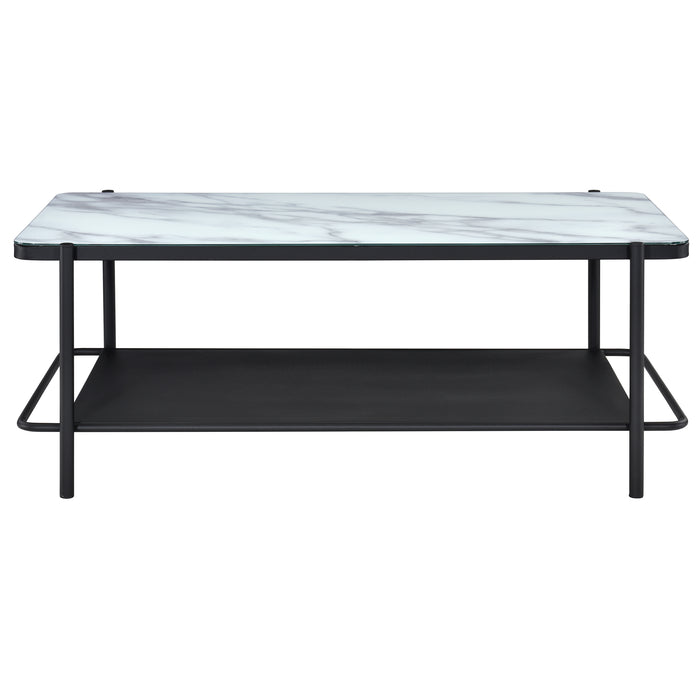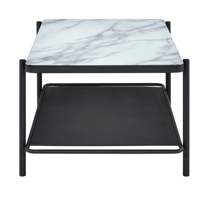 Modern in design, this black and tempered marble glass coffee table is perfect for an urban home blending classic sophistication with engaging, minimalist modernism. The unexpected style combines a classic white marble-like tabletop with an urban metal lower shelf. This extra storage surface features a mesh structure perfect for storing away your laptop or tablet to cool off when not in use.