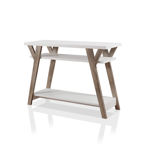 View full detailsGrace an entryway with this simply styled modern console table from the Joanna collection. With smooth white shelves and a rustic natural wood fram...
