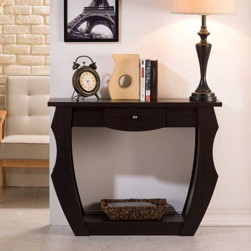View full detailsAs guests arrive to your home, they will be graciously welcomed by a modern espresso entryway table. The tabletop is lifted by chrome post details ...