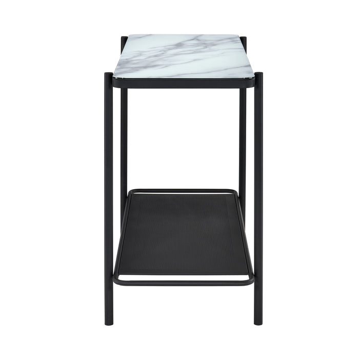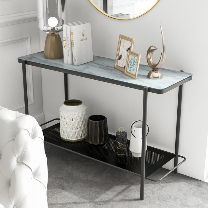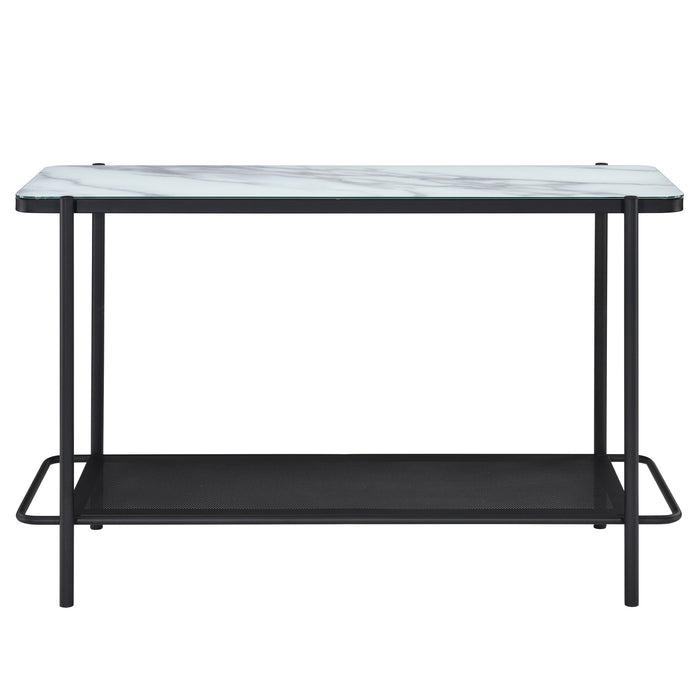 Modern in design, this tempered marble glass sofa table is perfect for an urban home blending classic sophistication with engaging, minimalist modernism. The unexpected style combines a classic white marble-like tabletop with an urban metal lower shelf. This extra storage surface features a mesh structure that contrasts the tabletop in an artistic expression adding functionality.
