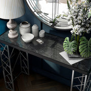 This modern and convenient marble console table adds opulence and splendor to your living space. It features a black marble top thats absolutely gorgeous and a lustrous metal frame and legs that add a touch of glam to this magnificent table.