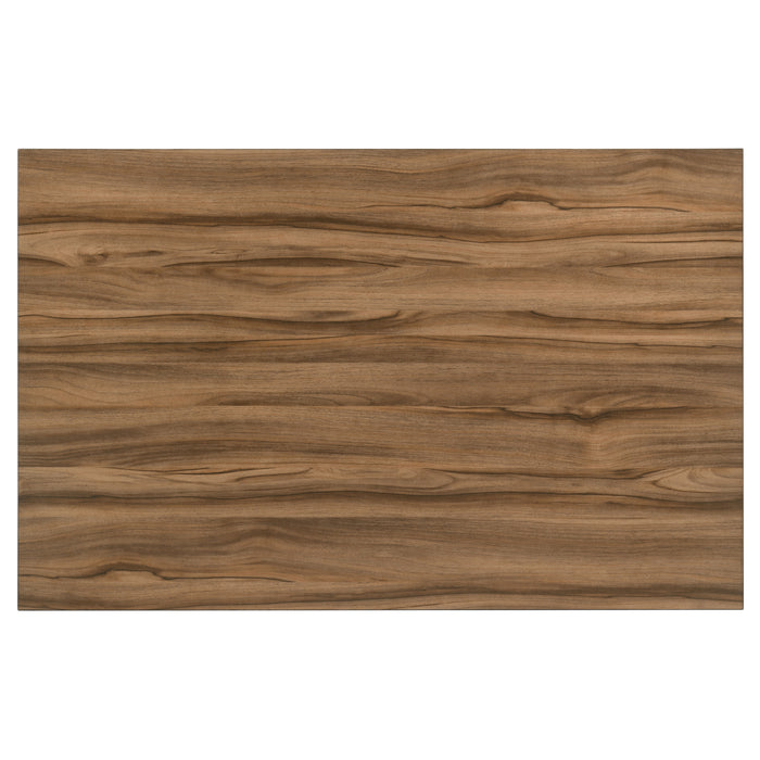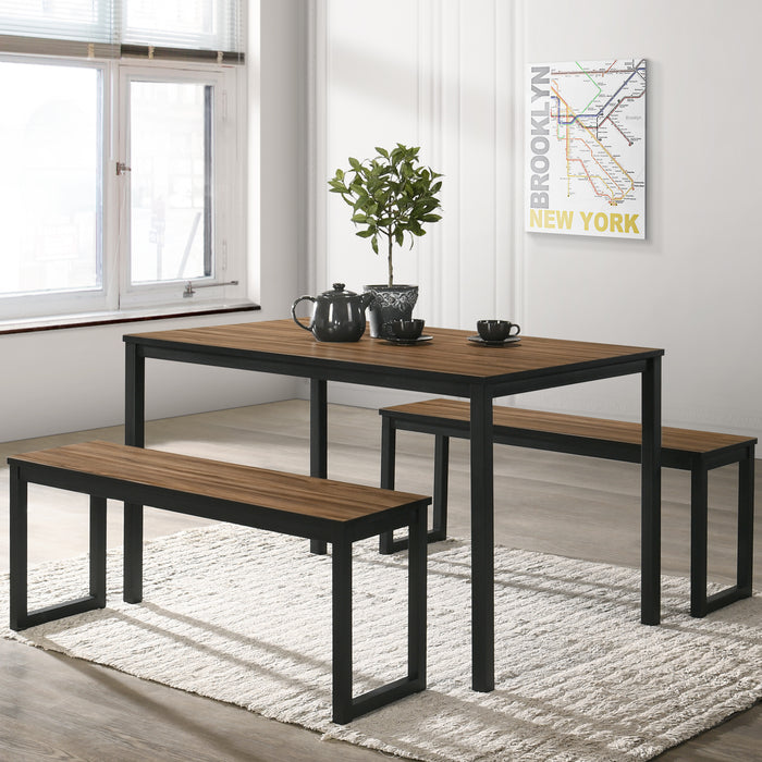 Add a minimalist allure to your dining area with this dining room set featuring a modest dining table and two benches that evoke a clean and modern look. A transitional style with sleek black metal legs pairs well with the wood tone of each piece.