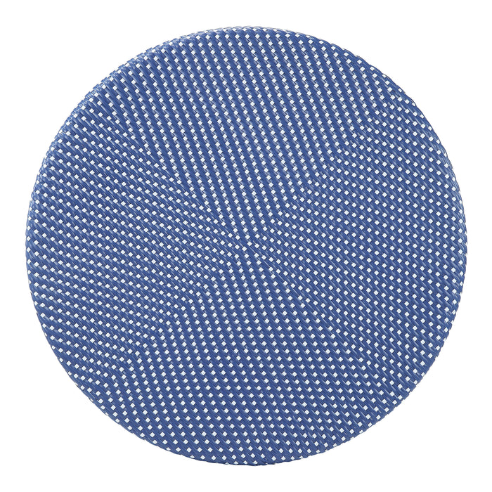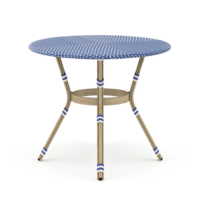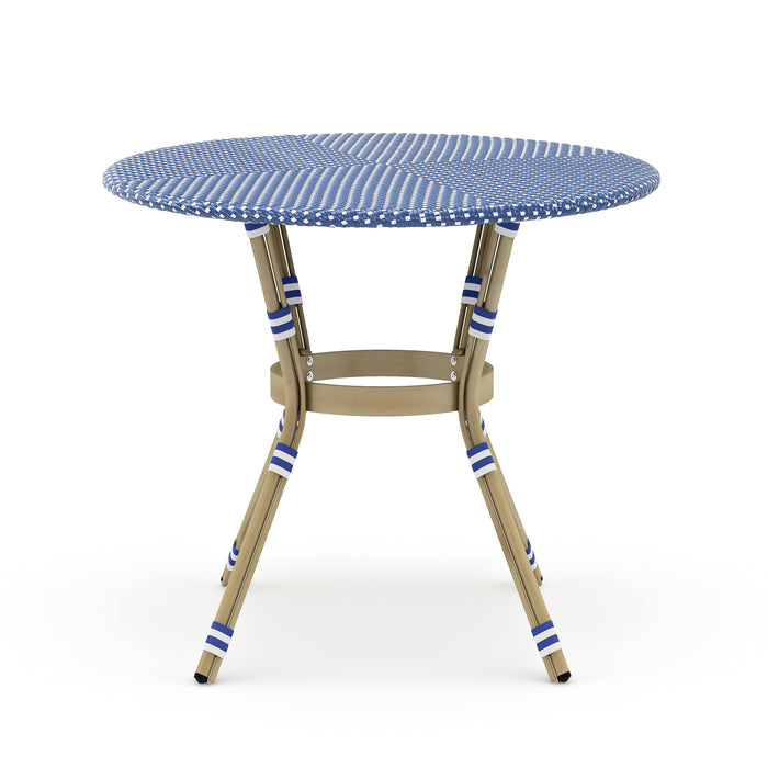 Entertain friends and family with a patio getaway. This ocean blue and white wicker-designed round counter height table is fit for your calm outdoor experience. The hourglass natural tone aluminum frame and plastic material tabletop are weather resistant. Water and UV resilience give this patio table a long life for countless parties.