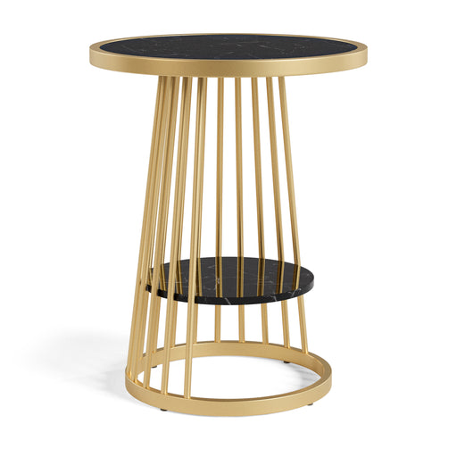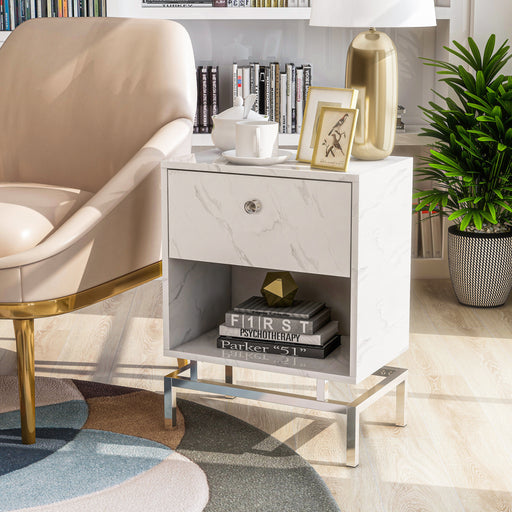 View full detailsTransform your living room with this sophisticated end table. Flaunting a high-class look, it showcases a faux marble finish tabletop with beautifu...