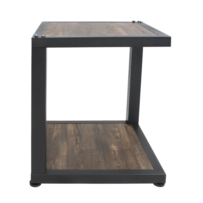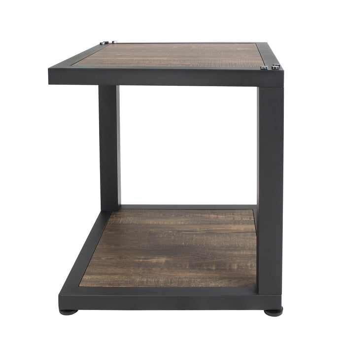 Asymmetrical with a sculptural flair, this industrial modern end table makes a striking addition to a rustic living room. Designed with a sand black metal frame with side supports at opposite ends, it supports an inset warm dark walnut finish on the tops and open bottom shelves, offering up ample space for showcasing decor and providing a table lamp. Silver rivet details push the industrial vibes.