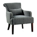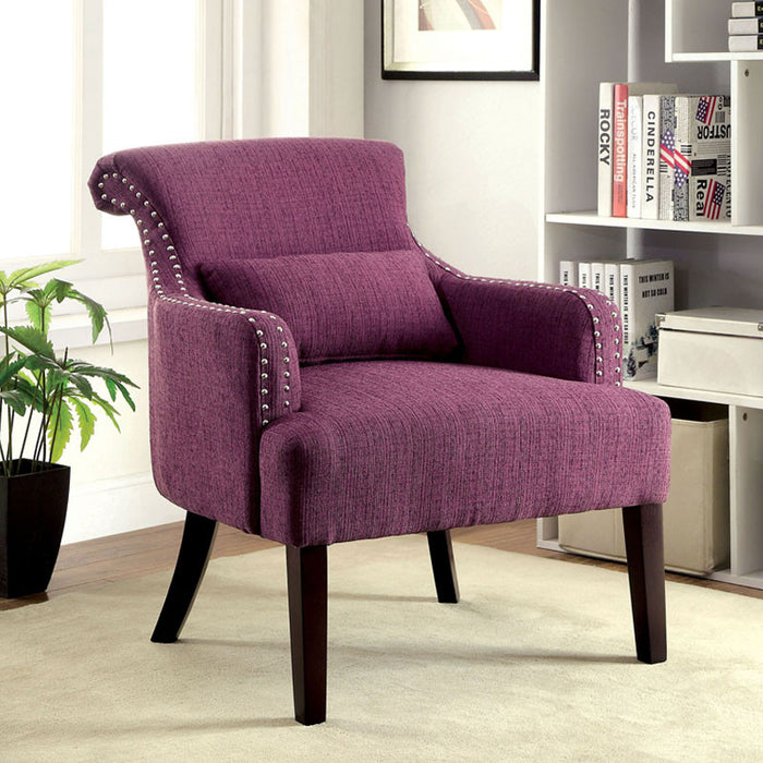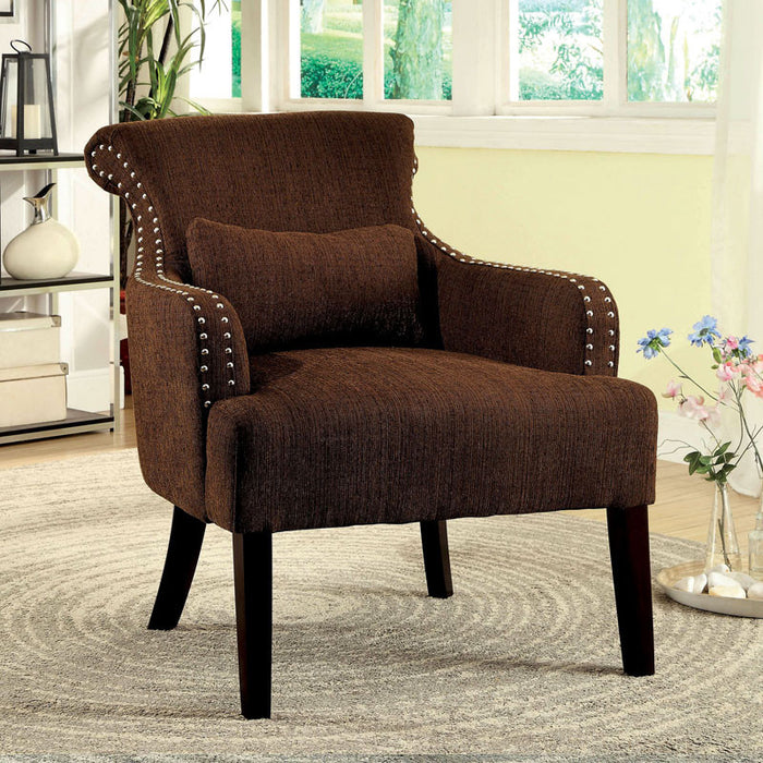 Graceful curves display beautifully against this unique accent chair. Nail head trim accentuates the scroll backs and track arms while seven variations of fabric colors complement the espresso finished legs.