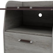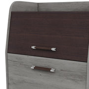 This stylish transitional file cabinet features a unique two-tone vintage gray oak and wenge finish with a functional lipped top. It offers versatile organization through a dedicated bottom file drawer and an upper storage compartment accessible via a lift-up cabinet door.