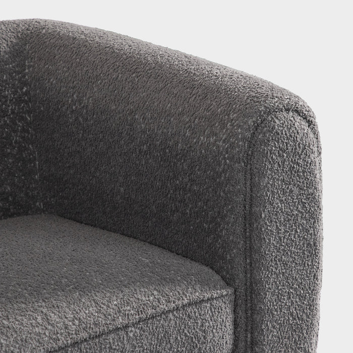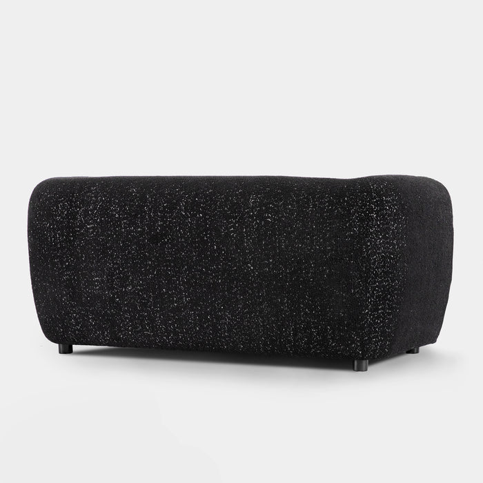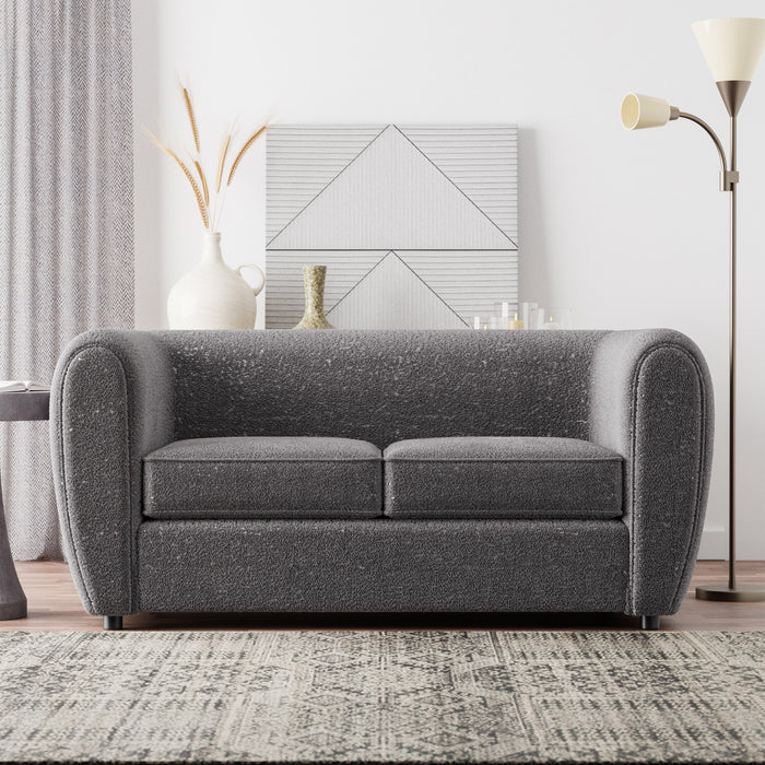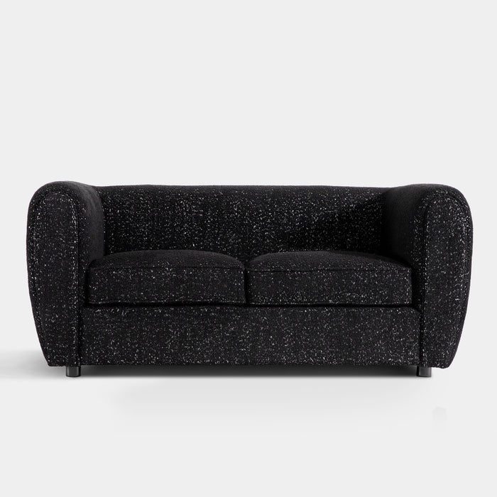 Our boucle loveseat is a harmonious blend of style and comfort. Wrapped in exclusive boucle fabric with a subtle metallic glimmer, it features an elegant tuxedo style that makes a statement without overpowering your space. The wooden legs add a timeless appeal, and with color options like off-white, charcoal gray, and black, it's designed to complement any room's palette.