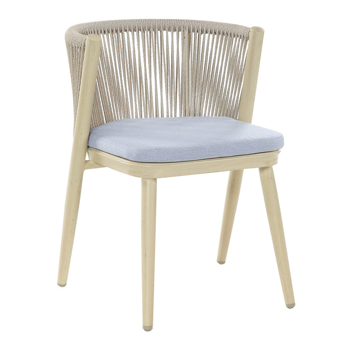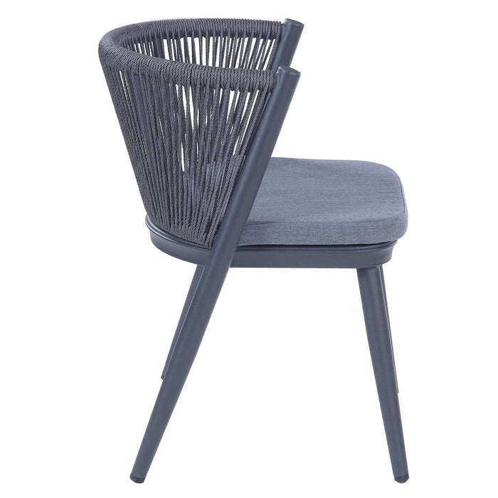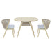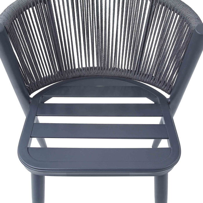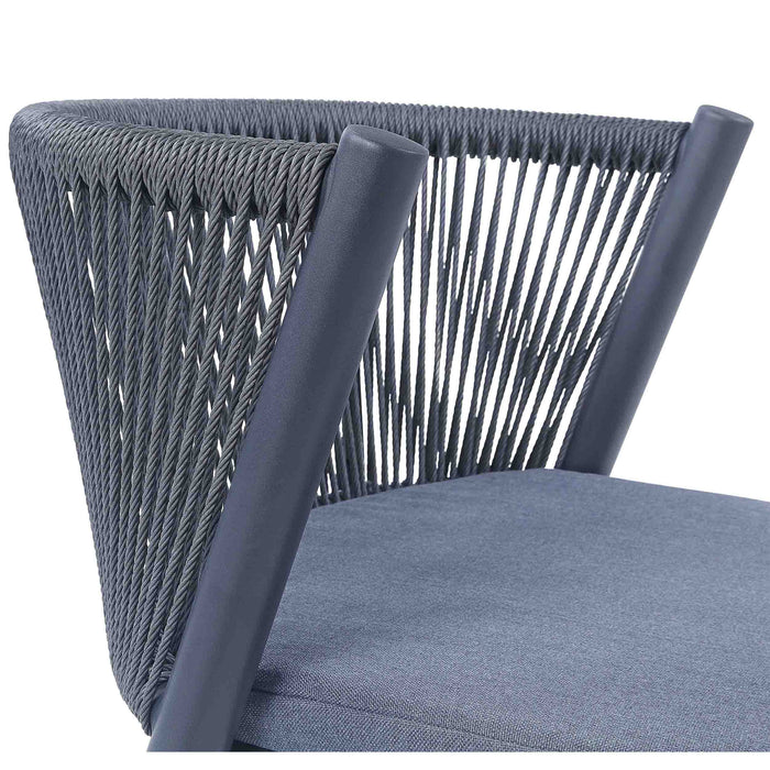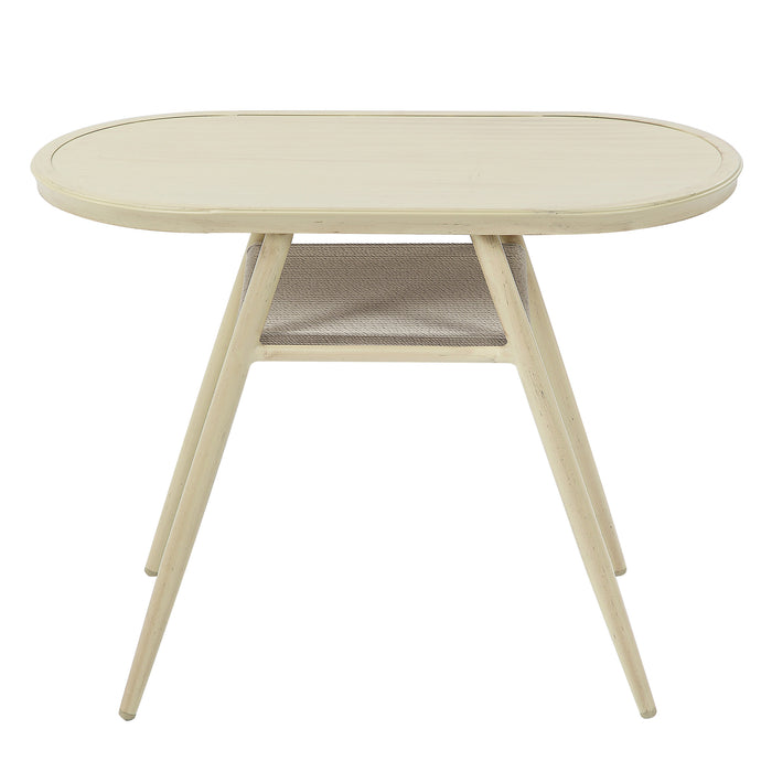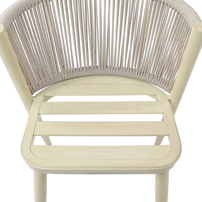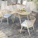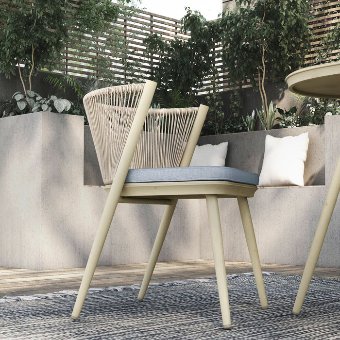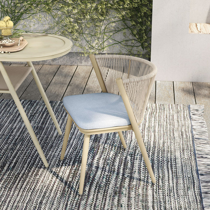 Give your balcony or patio a bohemian update with this 3-piece outdoor set. The design is made with small spaces in mind. Two chairs tuck perfectly within the table for compact storage, while an open wicker rope shelf offers a place to store placemats and coasters. Above functionality comes style itself. Webbed-back chairs highlight the rounded features and the mid-century modern legs of the set.