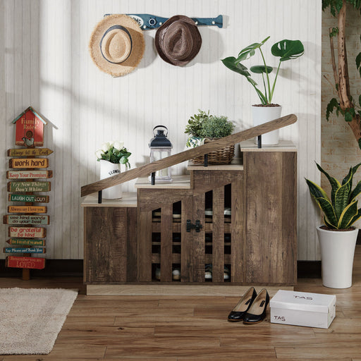 View full detailsAdd this novelty-style two-tone staircase shoe cabinet to your home and start conversations. The cabinet doors open up to shelves for shoes, while ...