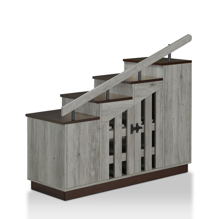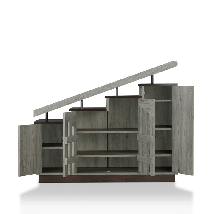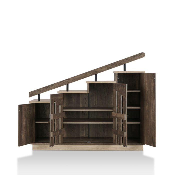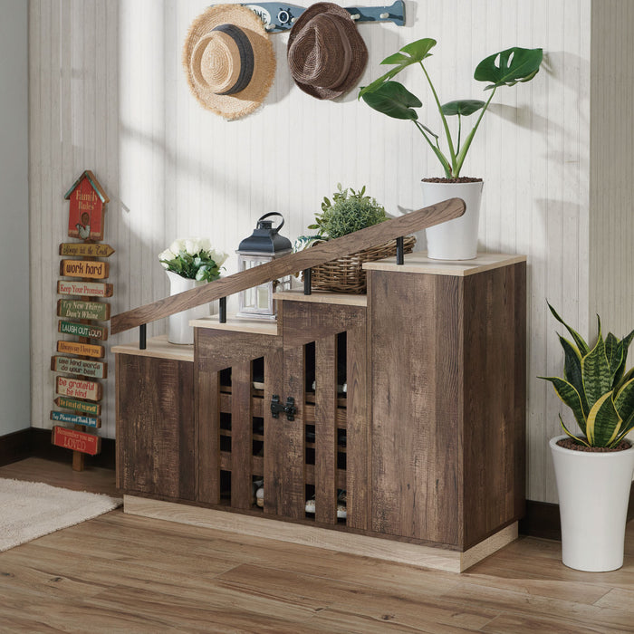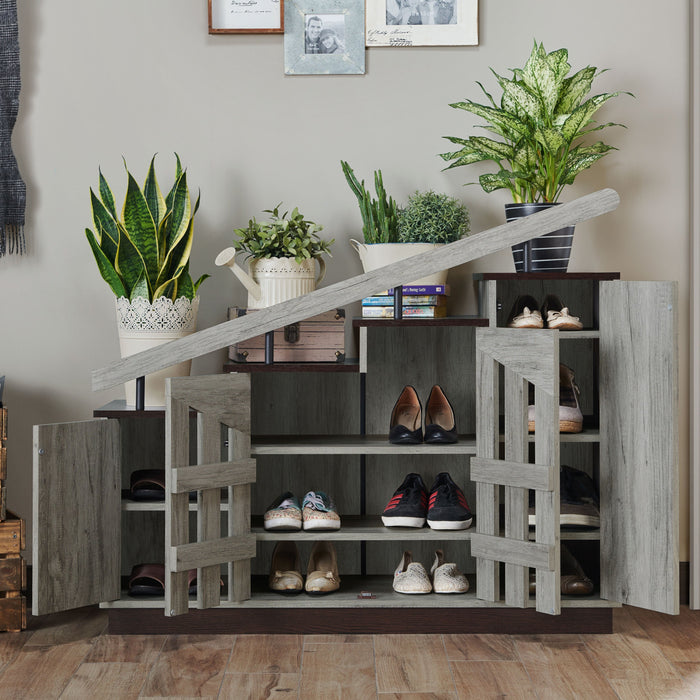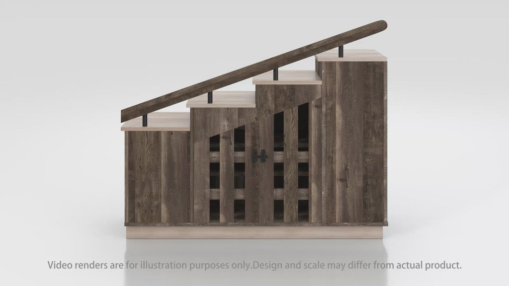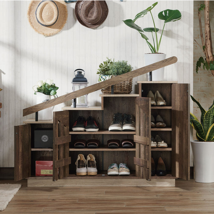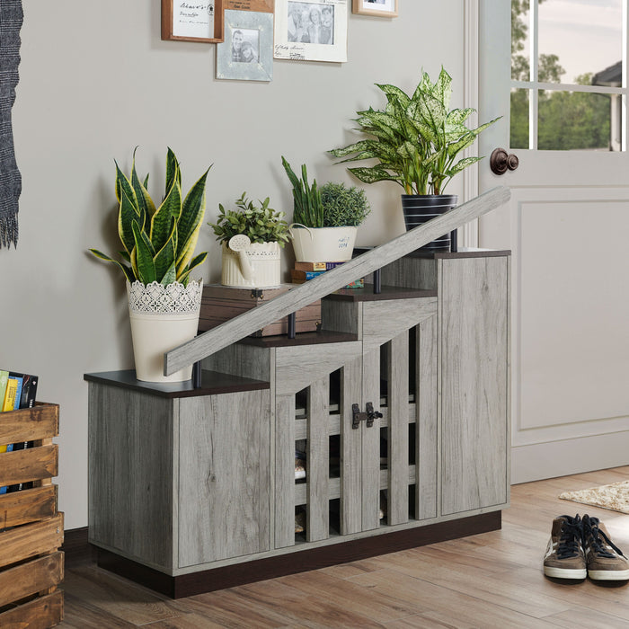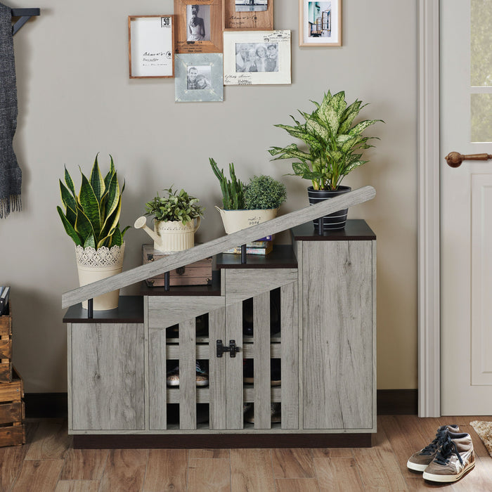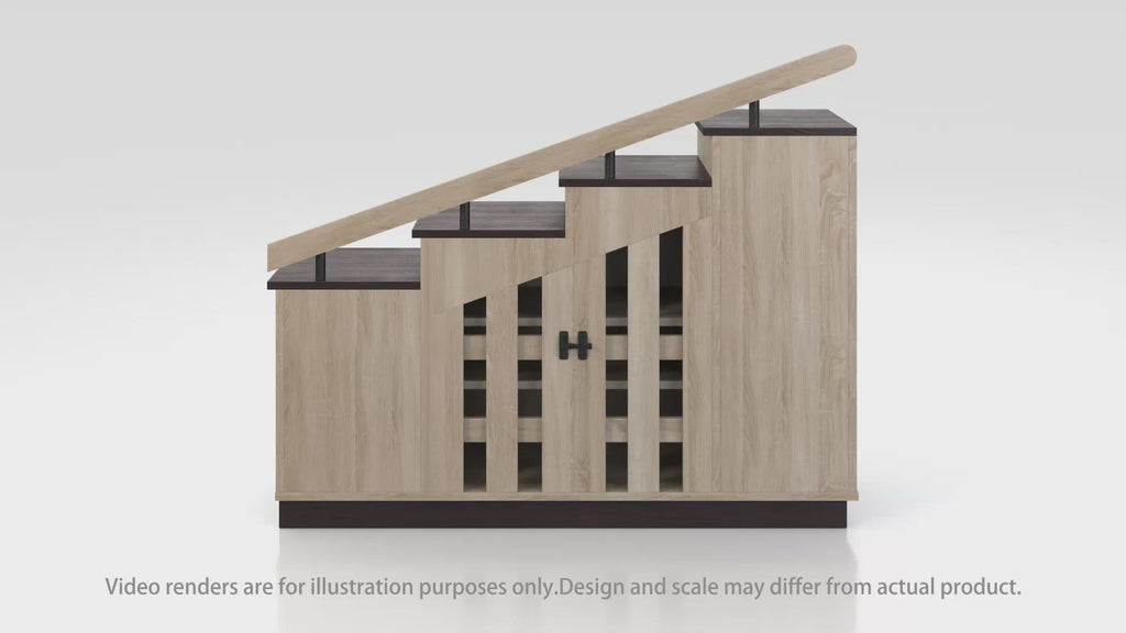Add this novelty-style two-tone staircase shoe cabinet to your home and start conversations. The cabinet doors open up to shelves for shoes, while the top is fashioned to resemble a staircase with a handrail.
