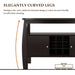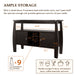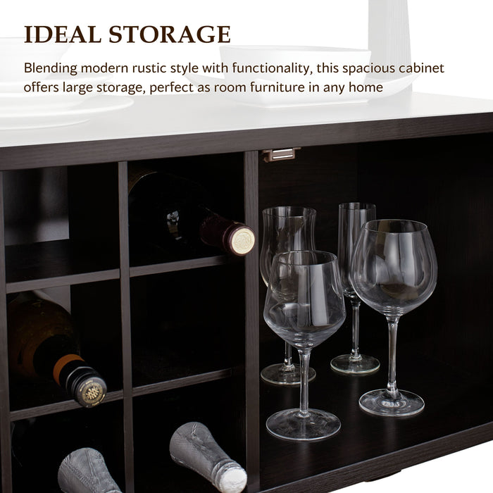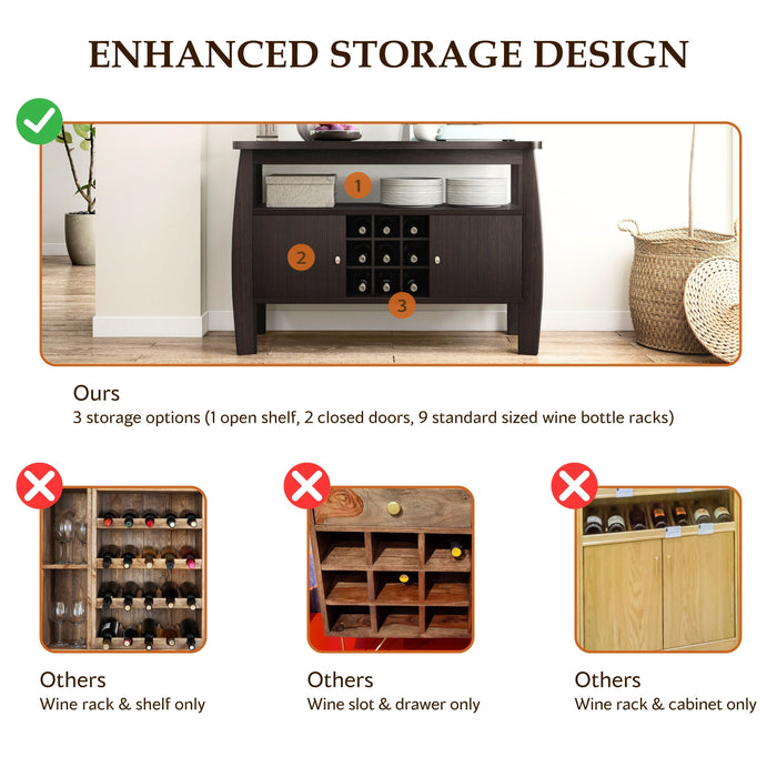 This dark espresso wine bar cabinet fits any dining room with the modest design. Perfect for storage and display, this piece features nine slots for wine bottles, flanked by two cabinets for other dining essentials.