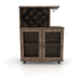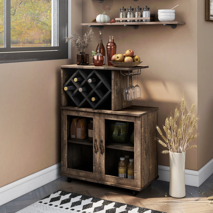 Entertain with ease using this portable and stylish wood wine bar cabinet, complete with mobile caster wheels that allow you to transition rooms. Featuring black metal wire cabinet fronts and the inspired reclaimed oak finish, this industrial-style mobile bar offers ample space for wine bottles and glasses, making serving a breeze.