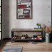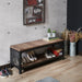 This industrial style shoe bench is not only practical but also aesthetically pleasing. Highlighted by a reclaimed oak finish featuring wood grain details, the two-tier bench with two expansive shelves for shoes makes a lovely addition to the foyer, front hallway, or walk-in closet.
