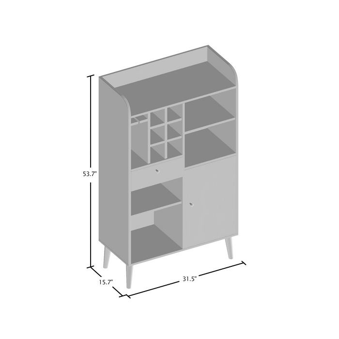 Bring retro charm and practical function to your dining or entertainment space with this Mid-Century modern mini bar, crafted in a warm distressed walnut finish. Designed with a mix of open and concealed shelving, it offers dedicated compartments for stemware, bottle storage, and all your mixing essentials—making it effortless to entertain like the neighborhood’s favorite host.