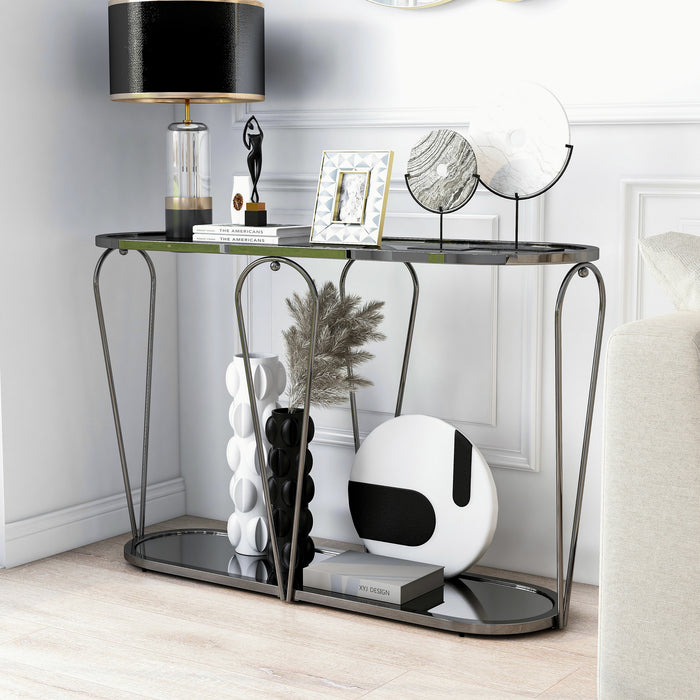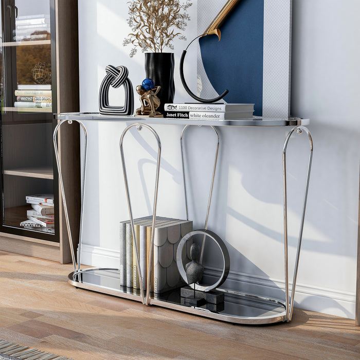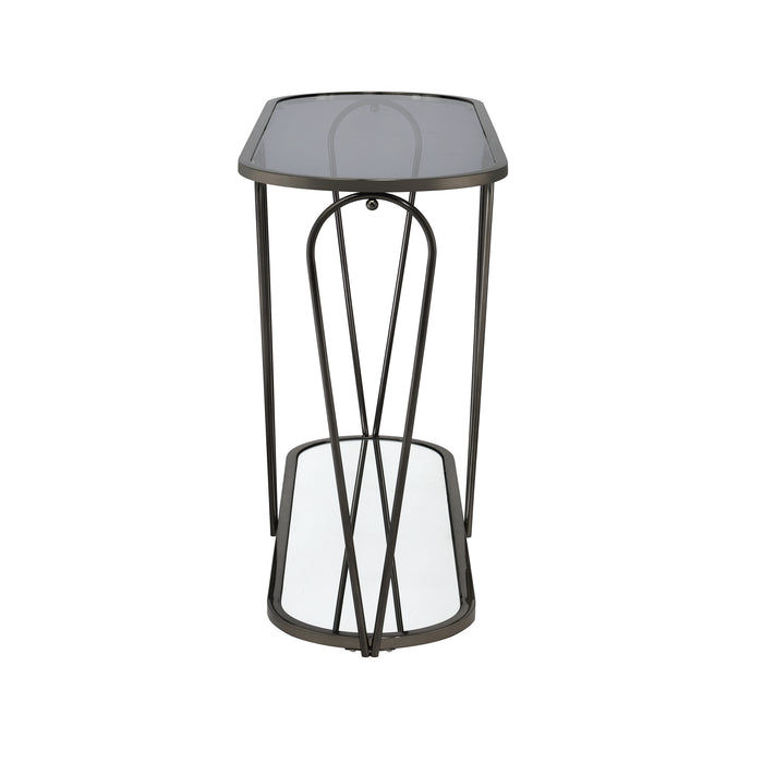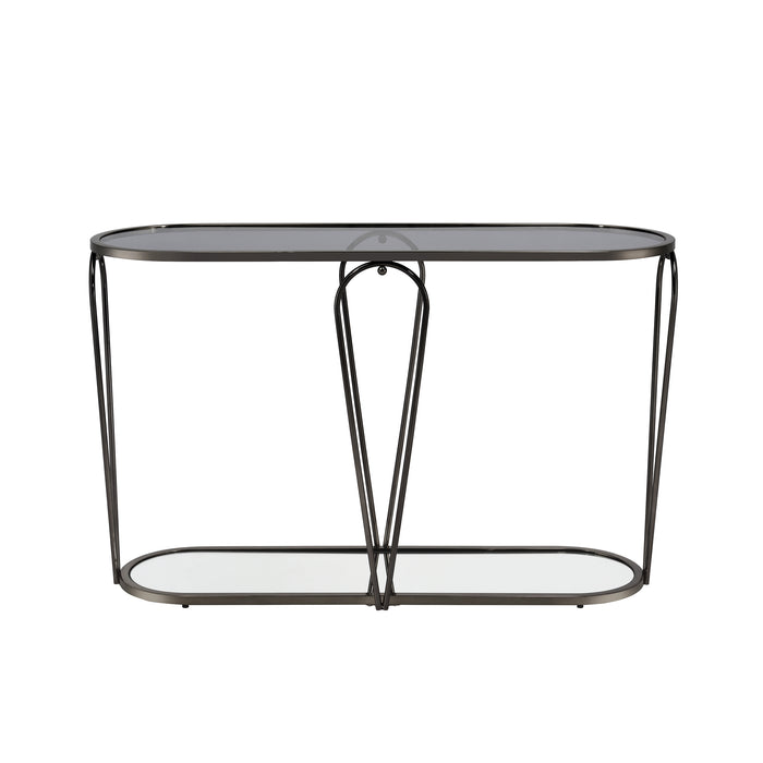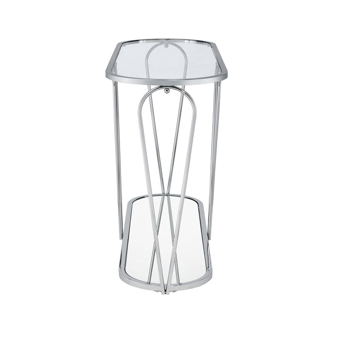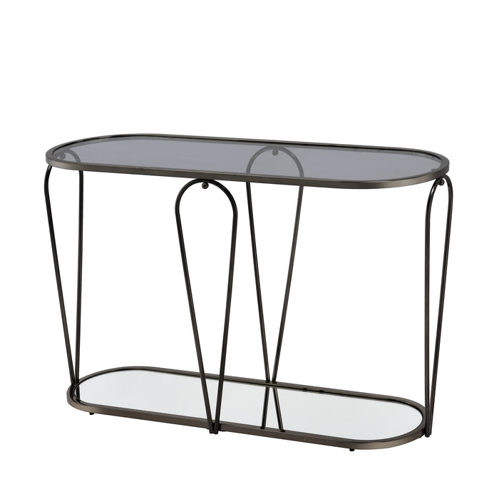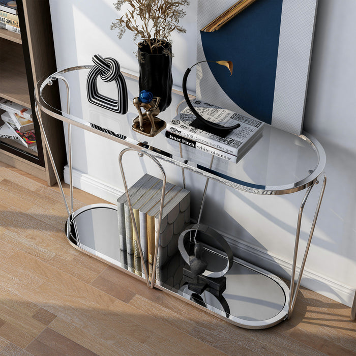 Eye-catching details and bold curves ensure that this modern oval sofa table captures attention in your home. A sophisticated design, the table features metal frame paired with a glass top and mirrored lower shelf perfect for decor. Accentuating the table, four inverted teardrop shaped supports and a low to the floor stance add enchanting style to perk up any sitting area.