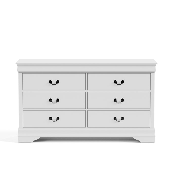 Offering timeless appeal, the Devi 6-Drawer Dresser features a stately silhouette with elegant molded detailing and bracket style feet. Ideal for any bedroom, this six-drawer dresser has a solid wood and wood veneer construction for optimal durability, promoting easy wardrobe organization for years to come. A beautiful black, cherry or white finish adds soft, subtle style to its transitional design. Equipped with six spacious storage drawers, and topped with elegant antique style handles, this dresser provides plenty of room for clothing, accessories, and undergarments. Place it together with a matching bed, nightstand, and chest, sold separately, for a pulled-together bedroom aesthetic that's sure to impress.