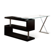 A delicate X-shaped chrome legs support a tempered glass top. These features define this undeniably glamorous executive desk that provides a contemporaneous ambiance to any office. The daring S-shaped shelving is design to pivot on an axis so as to adjust the angle of the desk.