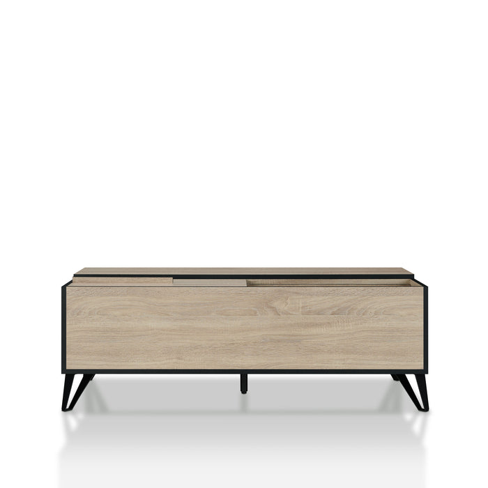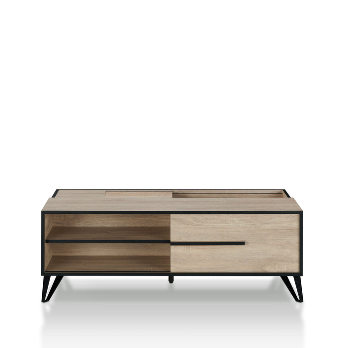 Express your love for clean architectural lines with this modern natural oak coffee table from the Evermore collection. The striking combination of the natural oak finish with black hardware adds to the punch of this alternating storage compartment design, perfect for a loft or modern apartment.