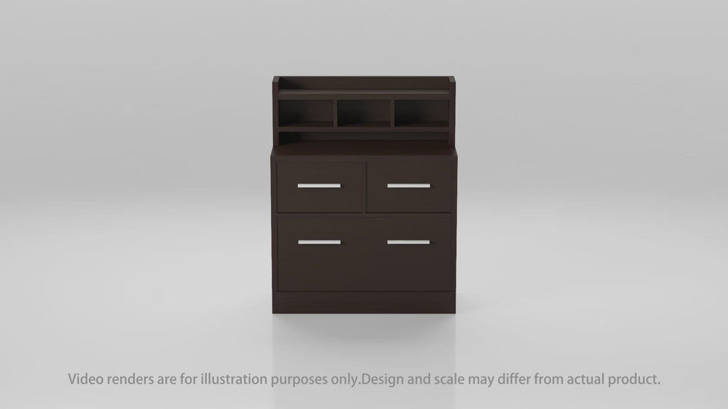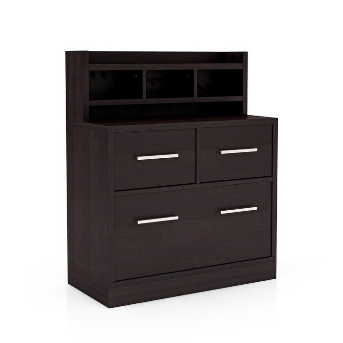 This storage cabinet is the perfect addition to any home or office, which features a multi-storage hutch, with two in one file cabinet, and accessorized with eye-catching metal hardware pulls, and storage that runs smoothly on metal glides.