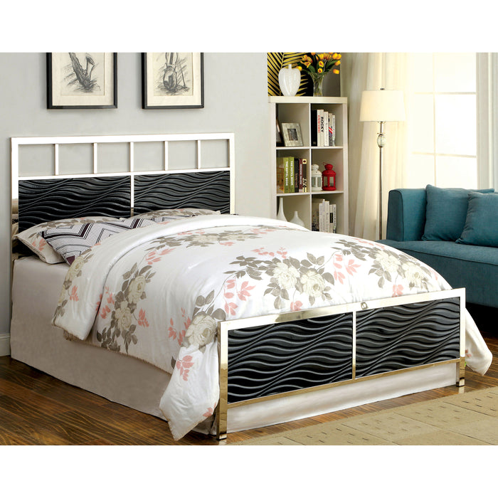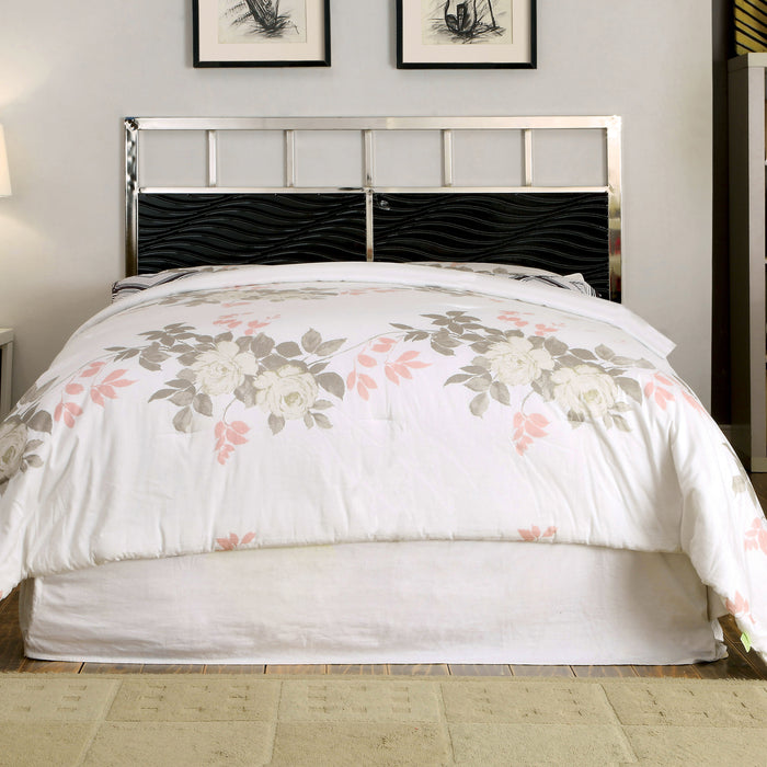 This headboard features a sophisticated modern design with a wave pattern over a metal frame. Rest in comfort along its comfy design and easily adjust the headboard to accommodate a Queen or Full bed.