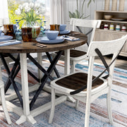 Create a farmhouse-style breakfast nook with this dining set. The trestle base round dining table features a spacious and classic dark walnut finish. To match the table, the x-back chairs offer a dark walnut seat in an antique white frame. The black accents bring the style together for that modern farmhouse look.