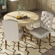 Create an elegant and inviting style with the beautiful rustic oak and ivory fabric dining chair. Soft textured linen fabric wraps the beautiful tufted backrest as nail heads distinguish the seats border. Warm legs have weathered touches for a dash of rustic appeal and slightly taper to complete its timeless look.