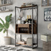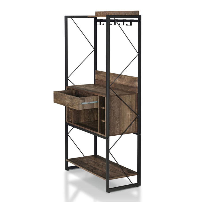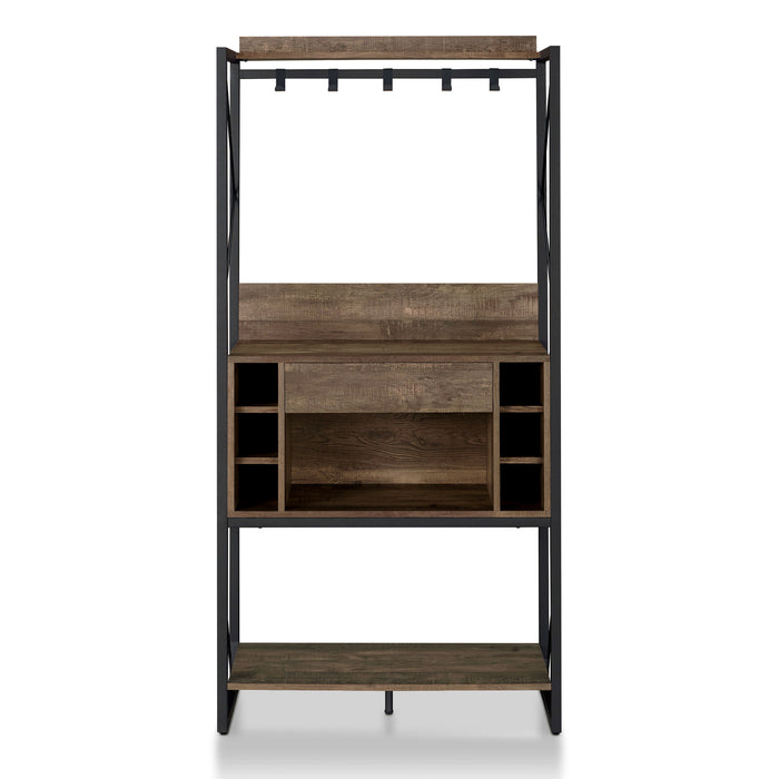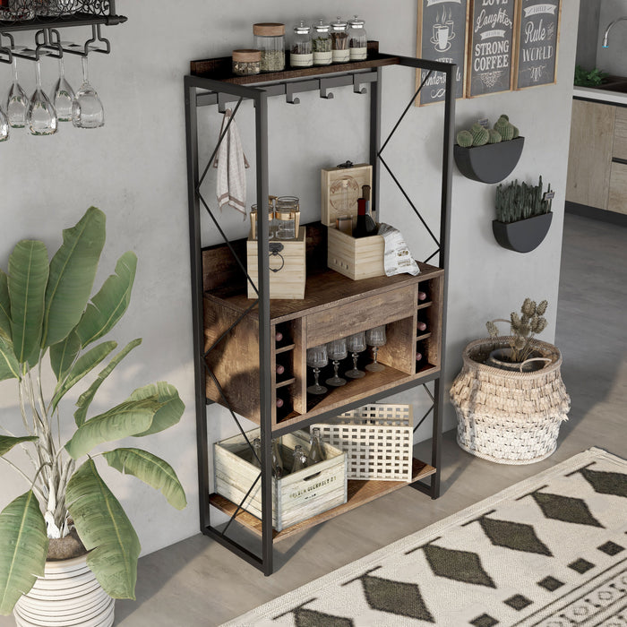 Keep all your bar essentials organized with this industrial home bar. A distressed finish sets a warm tone, perfect for the modern farmhouse theme. With hanging hooks as well as a variety of shelves, it seconds as a baker's rack. This multi-functional unit provides specialized storage for your bar essentials and includes multiple shelves and hanging hooks for kitchen tools or display.