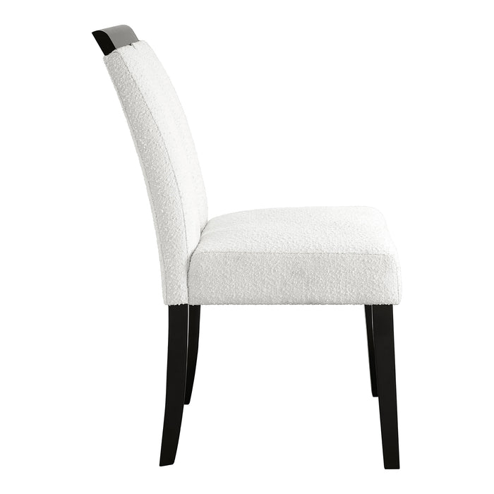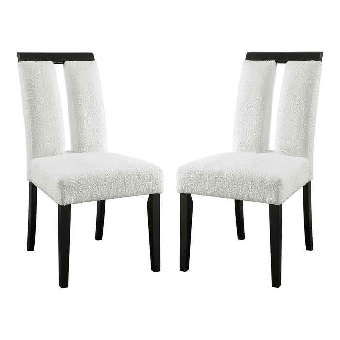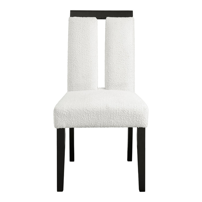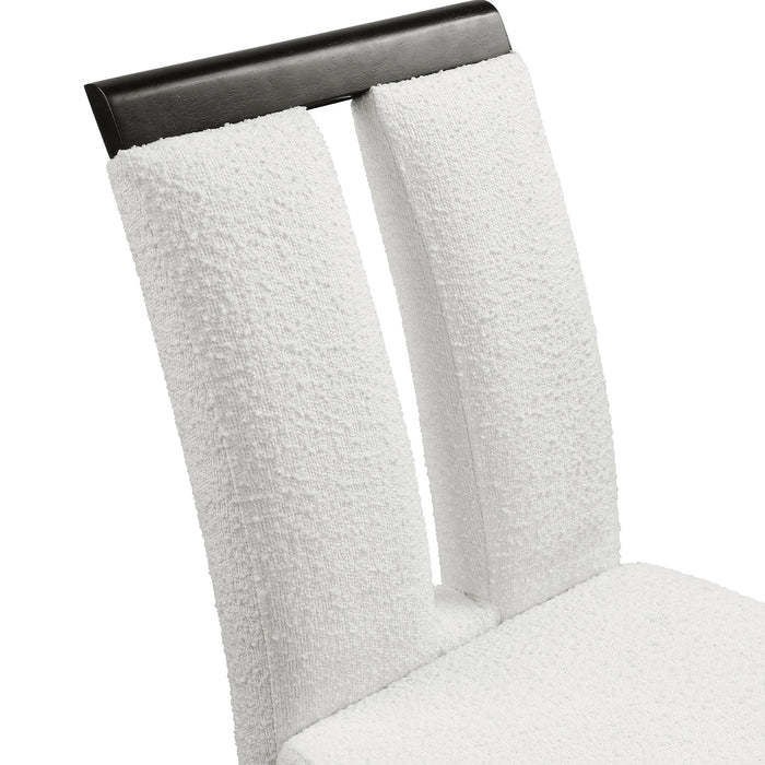 Enhance your home with these elegant chairs, offering a two-tone design with a timeless black frame. Choose from cozy boucle fabric or classic faux leather in white to complement your decor. Further allure comes in the form of the chic keyhole design of the seatback, as well as the tapered legs, which slightly flare in the back. These ultra modern chairs have a design and comfort perfect for any dining space, yet are versatile enough for use in a living room or entertainment area.