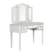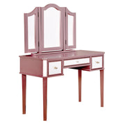 This strikingly elegant vanity and table set is adorned with mirrored inserts and gorgeous crystal-like acrylic accents. The padded fabric stool, adjustable tri-fold mirror, and spacious drawers all add to the charm of this one-of-a-kind piece.