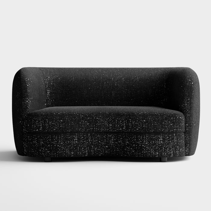 Make your living space cozy and trendy with this boucle loveseat. Its exclusive boucle fabric with metallic undertones adds a touch of glamour, while the tuxedo-inspired design and curved arms and backrest offer a contemporary flair. The kidney-shaped tight single seat cushion invites you to relax with a good book or enjoy a chat. Choose between the soft off-white, the modern charcoal gray, or the bold black to best complement your interior decor. The subtle round wooden legs support this stylish piece, promising both comfort and durability.