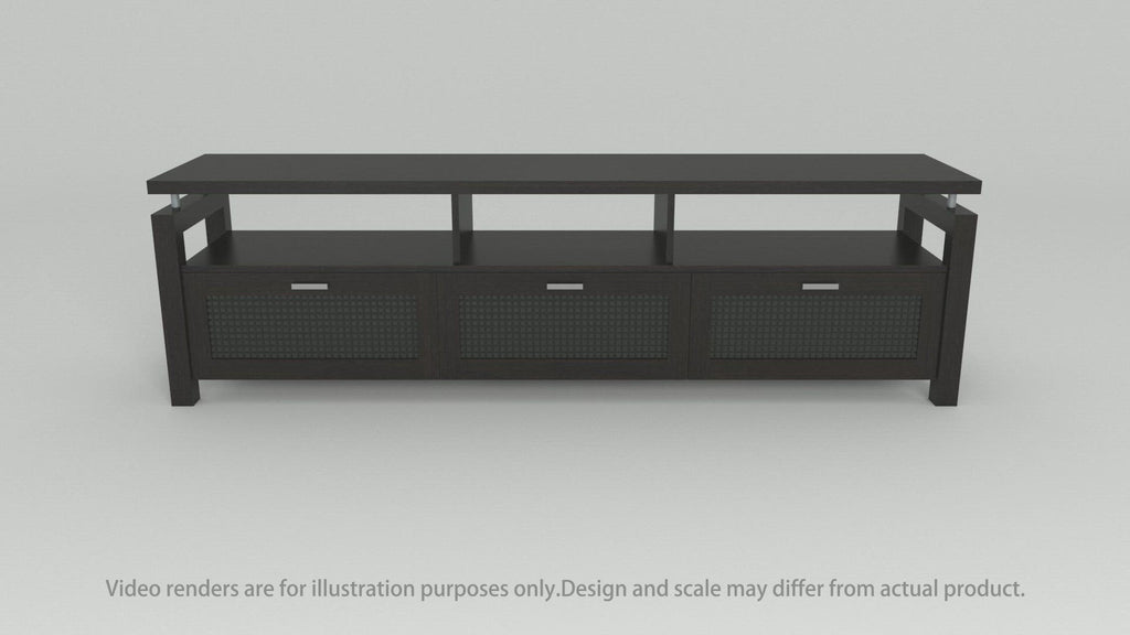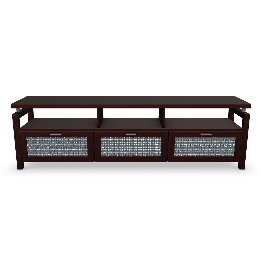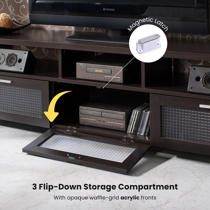 Update your home with the rich finish and silver accents of the Chance Espresso TV Stand. The raised top adds a fun modern visual and provides extra space for the open shelving to fit all your electronic needs. The textured frosted panels fold-down to reveal enclosed storage for additional movies and games.