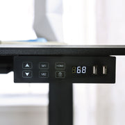 This fancy height adjustable desk provides the user with the ultimate personalization and customization. Two (2) memory buttons keep saved favorite heights for future use. Two (2) USB ports provide a functional tool for charging.