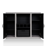 Display this striking buffet cabinet in your kitchen or dining room for added storage and style. It features a bold, cement-inspired frame that contrasts sharply with the interior and cabinet doors. The design includes a built-in wine rack, interior shelving for party provisions, and a unique, removable storage box that adds versatile style anywhere you need it.