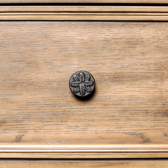 A dark oak finished nightstand makes the perfect farmhouse-style bedside table. Though it serves a country look, the drawers open on smooth metal glides for a modern quality. As you settle into bed, store your heirloom jewelry close by in the felt-lined top drawer.