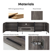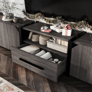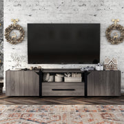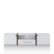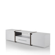 This sleek modern-inspired TV stand boasts a charming two-tone finish with multiple storage options. The flat panel doors conceal spacious shelves to store electronics and accessories without losing that linear appeal.