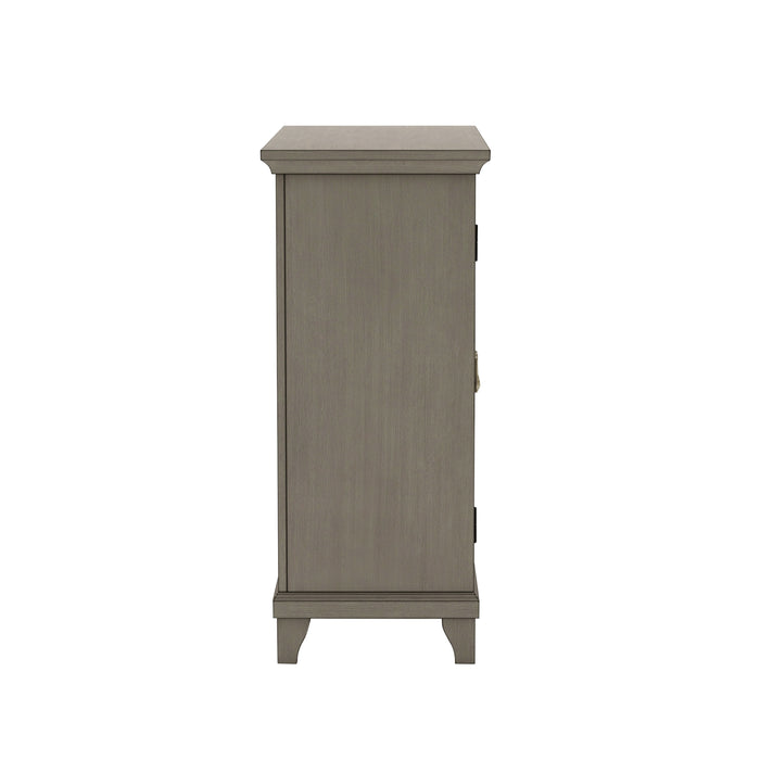Instantly create charm in your hallway with this hallway cabinet, offering a wonderful option to display your items while simultaneously adding character to your space. Two cabinet doors open to reveal two shelving units to organize your essentials. A gray finish with geometric designs overlay the cabinet doors, while crafted from engineered wood, poplar wood, and MDF.